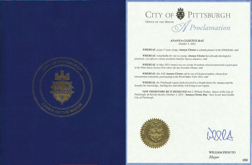 - "Ananya Cleetus Day” Proclamation from Mayor of Pittsburgh
